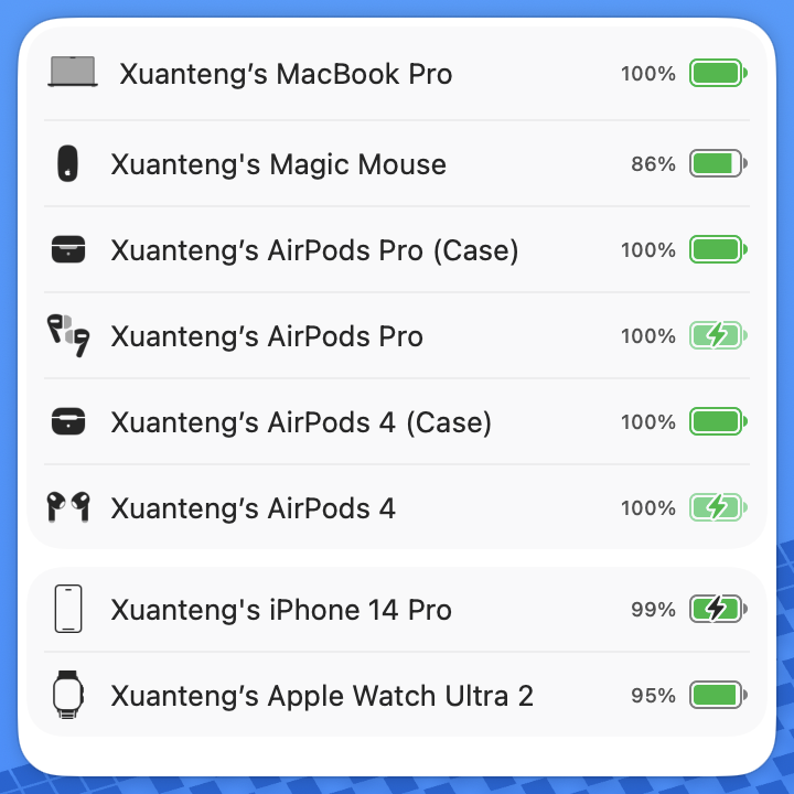 有时候蓝牙鼠标、键盘用着用着会经常忘记充电,Air Buddy 是一个能够在 macOS 桌面上实时显示你 Apple ID 下设备和已连接的蓝牙装置状态的 Widget。