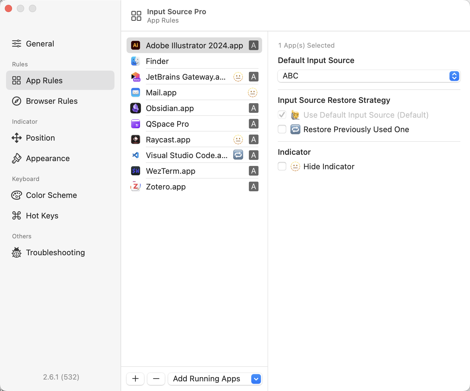 在工作中经常会遇到需要频繁在不同应用间切换的场景,而有时候不同应用使用的输入法不同,比如说会在 Word 中进行中英文的输入,而在代码编辑器/终端模拟器中则只会使用英文,同时在浏览器中搜索文档也会采用中英文混合输入。 在不同应用间切换的时候通常还搭配额外的一次输入法输入,显得有些繁琐,Input Source Pro 这个软件提供了为不同应用设置默认输入法的功能,允许用户为每个应用指定默认的输入法,或者沿用上一次切换到这个应用所使用的输入法。