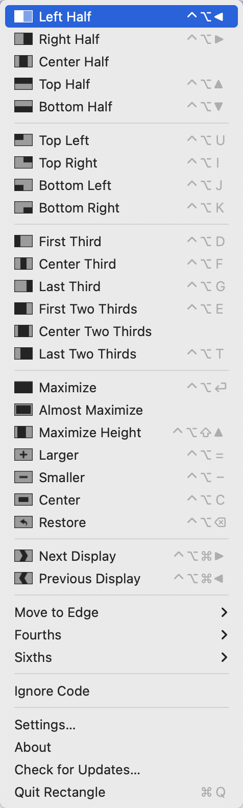 Raycast 还支持通过快捷键快速调整窗口大小(比如全屏,左右半屏,上下半屏等),在 Extensions - Window Management 中设置对应的快捷键即可。 当然,也可以使用单独的软件进行管理,比如我目前使用的社区提供的开源的 Rectangle,功能都大差不差。