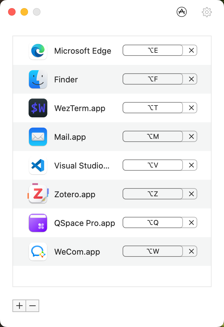 通常,你可以按照对应软件的名称或者缩写来设置快捷键,例如 VS Code 对应的按键组合为 ⌥ + v,Zotero 对应的组合则为 ⌥ + z,这样方便记忆同时也能养成习惯性的肌肉记忆。 在熟练之后,你就可以通过简单的快捷键快速地在应用间切换,不必每次都使用鼠标进行应用切换,减少了上下文切换带来的手指和心智开销。