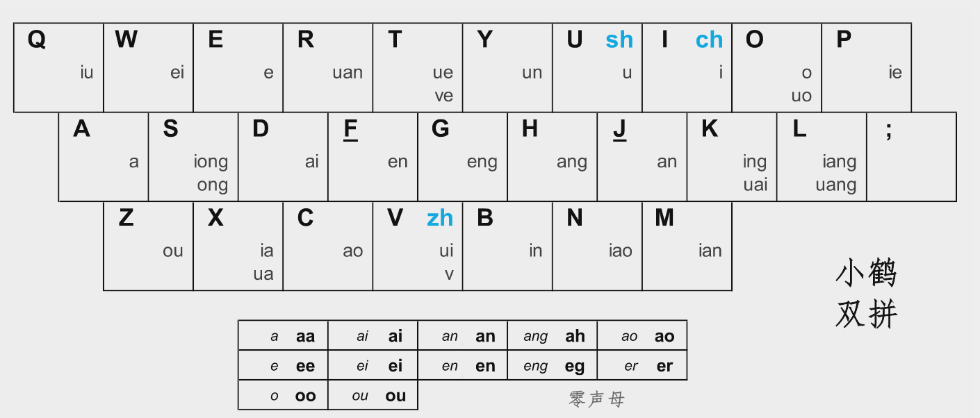 目前市面上有好几种主流的双拼方案, 我选择的是较多人推荐的小鹤双拼方案, 主要原因是键位看起来比较简洁. 此外, 小鹤双拼的键位设计对于我来说相对来说容易记忆.